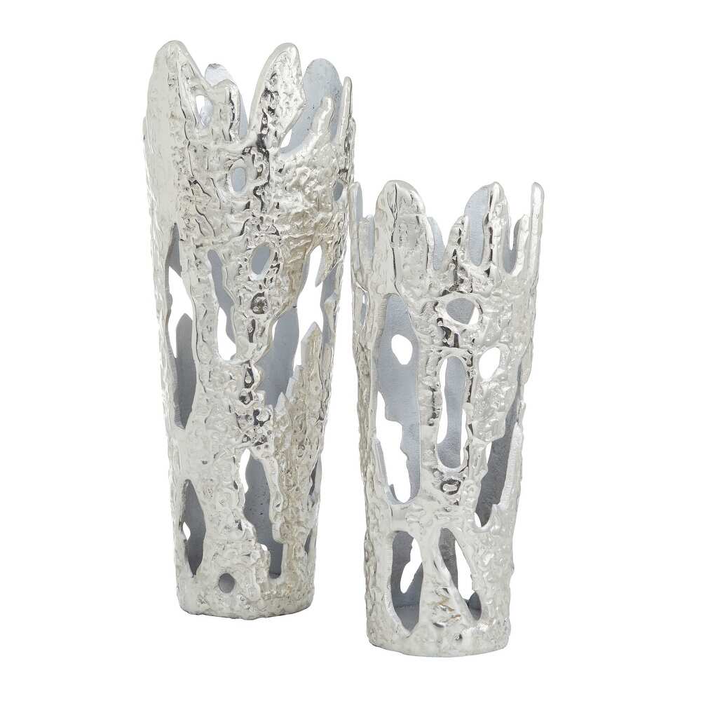 These metallic Silver vases are stunning focal point decorations for the living room, the dining area, and the bedroom. This item ships in 1 carton. Suitable for indoor use only. Made in India. This vase comes as a set of 2. Contemporary style. Vases have a 6 in, and 7 in mouth openings.